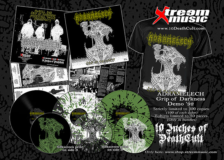 ADRAMELECH Title: Grip of Darkness (Demo 1992) Ref.: XM 307 MLP / DeathCult #11 Release date: 20.11.2020 Track list: - side A - 01. Mortal God 02. Grip of Darkness 03. Ancestral Souls 04. Dreamdeath - side B - Silkscreen printed demo artwork Description: Official re-issue on 10" vinyl, only available through the Xtreem Music mailorder, of the Demo '92 "Grip of Darkness", by this mythical Finnish Death Metal band. Side B comes with silkscreen printed cover art. The insert includes the full demo cover, photos, flyers, show posters... Vinyl is limited to: - 100 Olive green with black splatter - 100 Clear with white & olive green splatter - 100 Classic black wax Band Website: http://b.link/adramelech |