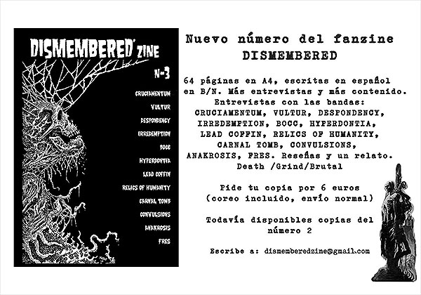 Printed fanzine in good quality, written in spanish, A4, 63 pag. Interviews with Cruciamentum, Vultur, Despondency, Irredemption, Bocc, Hyperdontia, Lead Coffin, Relics of Humanity, Carnal Tomb, Convulssions, Anakrosis, Fres... plus album reviews...