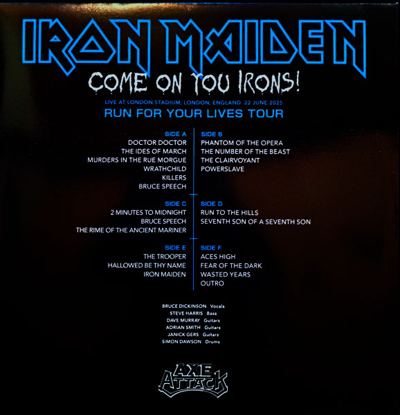 Unofficial live album, limited to 200 copies on 3-LP in blue wax with trifold jacket, containing a 21-track show at London Stadium (OK) on 28.06.2025